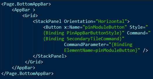 I am using XAML / C# for this example, but you can also use JavaScript / WinJS. First Step is to create an app bar button that will let me pin / unpin the secondary tile.