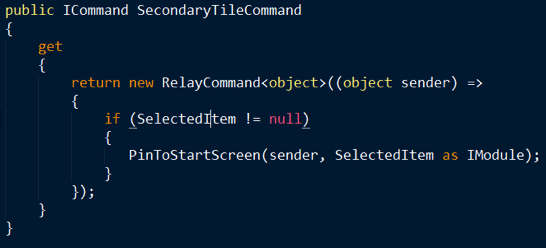 I implemented the command in my View Model as shown in the following code listing. I first check for the existence of a selected item, which in this case is the module that I want to pin to the start screen. If there is a selected item, the command invokes the PinToStartScreen method.
