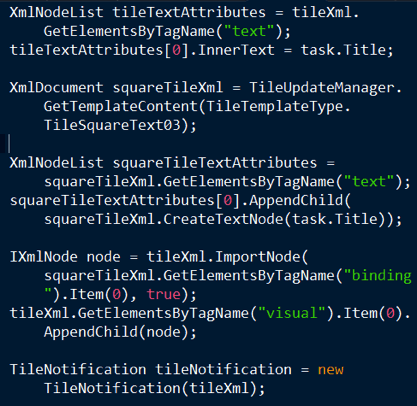 As an example of live secondary tiles, I show the most recent task. That code is shown in the next listing.