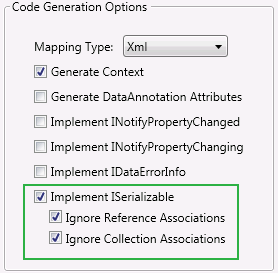 If you choose the default settings, the persistent classes will be decorated with the SerializableAttribute and will implement the ISerializable interface in the ISerializable Implementation region.