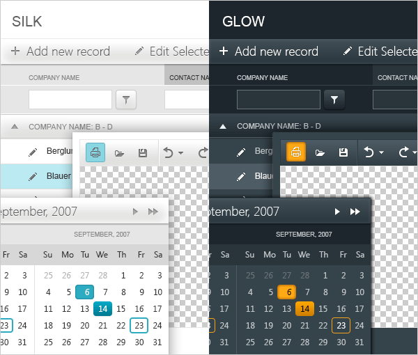 Silk and Glow are built according the CSS3 standards and the soft and slick feel is achieved by CSS3 gradients that will work perfectly in the latest versions of the browsers. Don’t worry, for all of you that still have to support older IE browsers (before IE10) the skins have a fallback system for the gradient and will also keep their layout. The rounded corners of the UI elements are, again, achieved by using CSS3, so do not be disappointed that they won’t be visible in IE 6, 7 and 8.