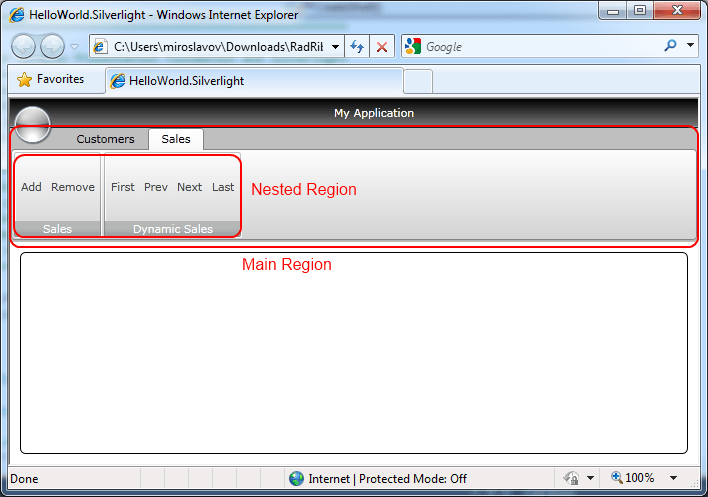 ModuleCatalog catalog = new ModuleCatalog().AddModule(typeof(CustomersRibbonTab.CustomersRibbonTabModule)).AddModule(typeof(SalesRibbonTab.SalesRibbonTabModule)).AddModule(typeof(SalesGroup.SalesGroupModule));As a result I get nested Prism Regions, where the main region has two Tabs and the nested Region tab has one static Group and one Dynamic.