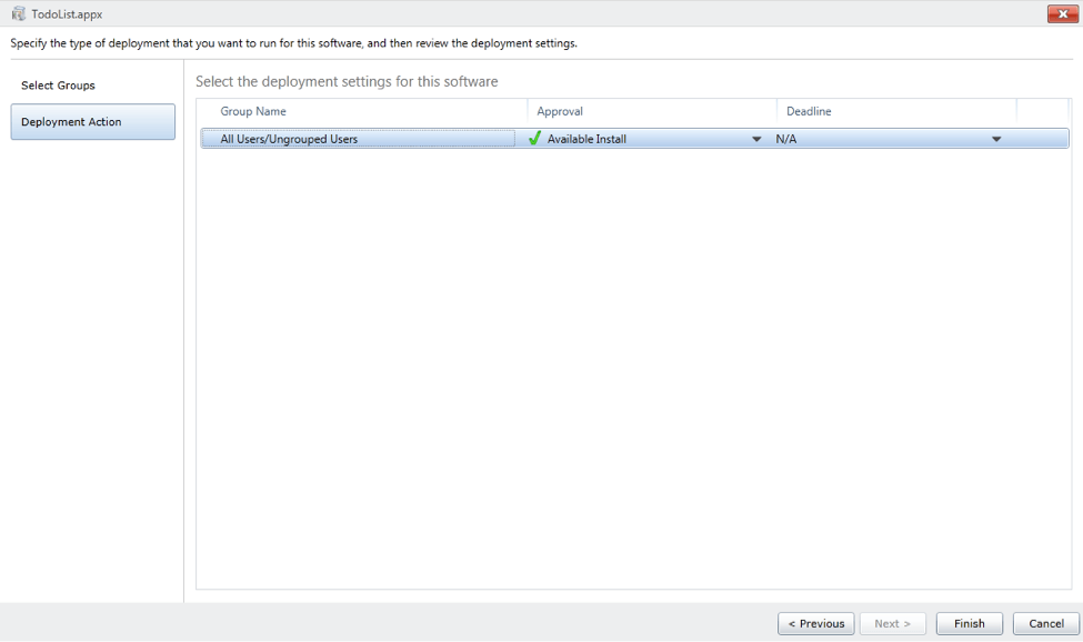 This will bring up the Deployment Action prompt where you select the group of users who will be able to install the app.