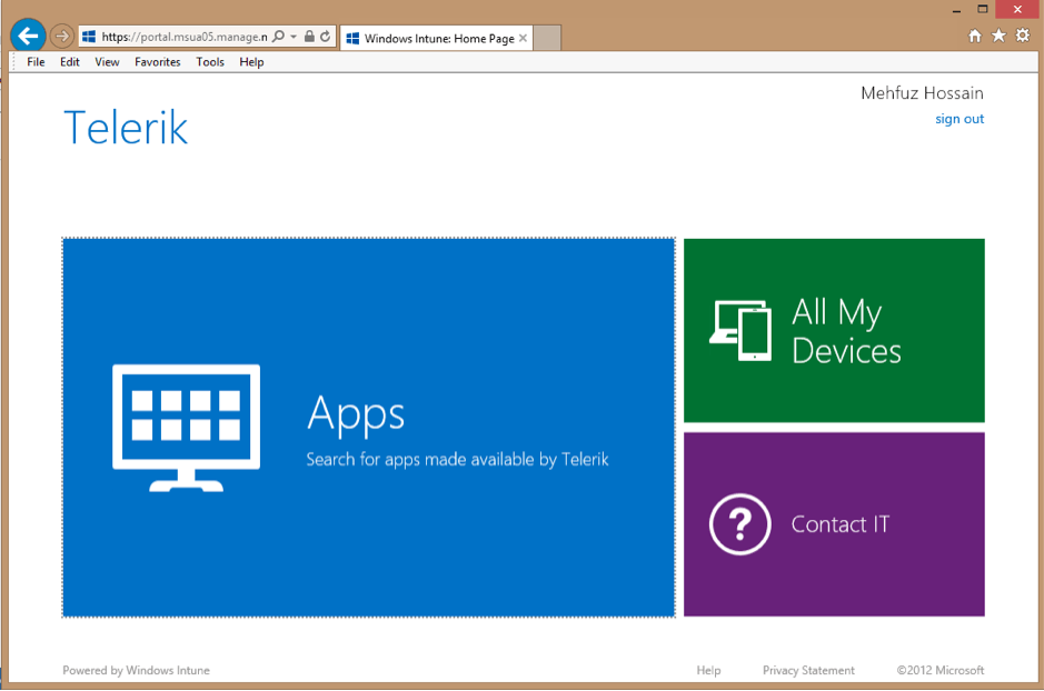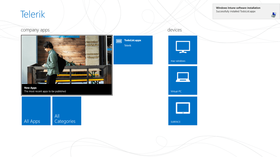 Last October Microsoft released an update to Windows Intune that let you deploy Windows 8 apps as well. Developers can install the fully immersive “Company Portal” app from the Windows Store and then install app made available by their company onto their devices. However in order to install apps from Windows Intune portal, devices must be enabled for sideloading.