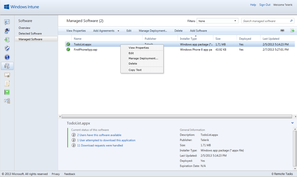 To enable Windows 8 devices for sideloading, it is required to obtain sideloading product activation keys. You can purchase these keys through the Microsoft Volume Licensing program. After obtaining the keys, they must be added to the portal using the Intune administrative console. This process is outside the scope of this post, so I used an alternative way to deploy apps to Windows Intune without processing the licenses. This approach is only for example purposes and not meant for real scenarios.