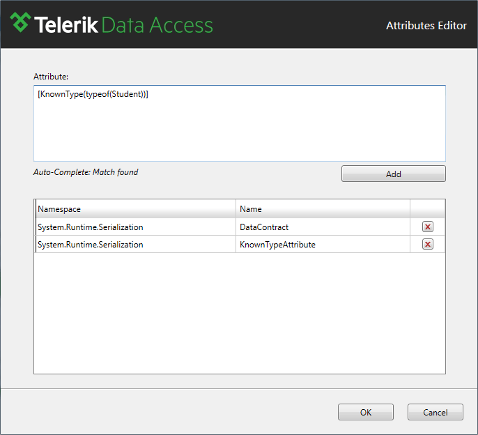 Now, all you need to do is type the KnownType attribute in the textbox and press the Add button. As with the Manage Attributes Model Operation, here the Attribute text box also offers Auto-Complete functionality in order to ease the input of the desired attribute. After pressing the OK button, you will need to Save the model before the attributes are applied to the code.