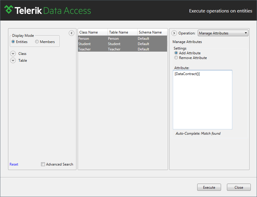 The Manage Attributes Model Operation lets you quickly and easily add and remove attributes for multiple entities or members at once. We will use this model operation to add DataContract attribute to our entities and DataMember to their members.