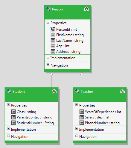 Let us check out this new functionality in action. To do this we will go through a common scenario where we need to use our persistent classes as a data contract for a Plain WCF Service. We will decorate the entities in the following model with the required attributes – DataContract, DataMember and KnownType: