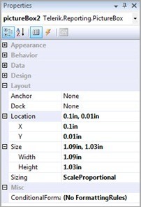 In addition to offering multiple ways with which to bind an image to a report, the PictureBox report item also allows you to modify the way the image is displayed on the report. Using the PictureBox’s Location property you can adjust the distance the image is displayed from the top-left corner of its container. A report item’s container is any item within which the item is displayed, whether it be a report section, a Panel report item, etc. You can also use the Size property to manually adjust the size of the PictureBox item.