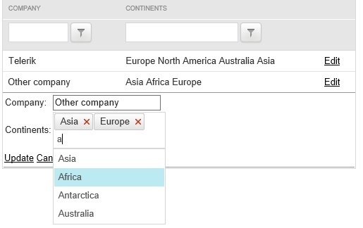 <telerik:GridBoundColumn DataField="CompanyName" UniqueName="Company" HeaderText="Company"></telerik:GridBoundColumn><telerik:GridAutoCompleteColumn DataField="Continents" UniqueName="Continents" DataTextField="Name" DataValueField="Value" DataSourceID="XmlDataSource1" HeaderText="Continents" Filter="StartsWith"></telerik:GridAutoCompleteColumn><asp:ObjectDataSource ID="CompanyDatasource" runat="server" TypeName="MyDataProvider" SelectMethod="SelectCompanies" UpdateMethod="UpdateCompany" InsertMethod="InsertCompany"></asp:ObjectDataSource><asp:XmlDataSource runat="server" ID="XmlDataSource1" DataFile="autocomplete.xml"></asp:XmlDataSource>public class Company{ public string CompanyName { get; set; } public string Continents { get; set; } public int ID { get; private set; }}<?xml version="1.0" encoding="utf-8" ?><Items> <Item Name="Asia" Value="1" /> <Item Name="Africa" Value="2" />. . . . </Items>