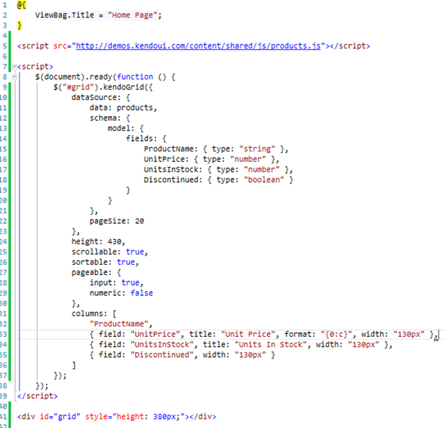 In the example below (part of which, I admit, I cribbed from the demos on the Kendo UI Demo page) you can see how a grid can be added to a page: