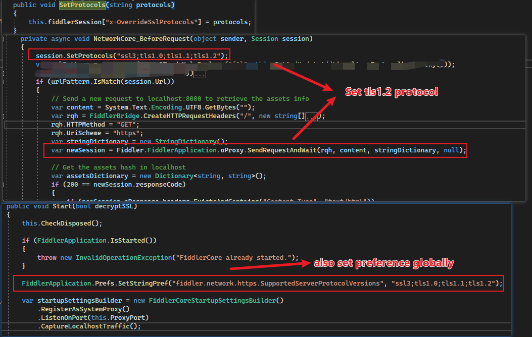 I've written a fiddle script to send another request to get the necessary info to proxy the original request via FidderClassic. It works fine with the tls1.2 protocol. But when I try to use FiddlerCore to do the same thing, I got the 502 error again(the error occured when I use FiddlerClassic without tls1.2 protocol).