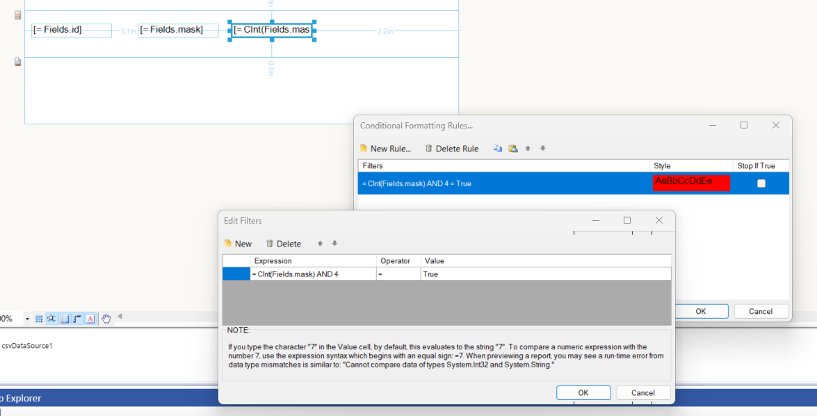 When I try to add the bit mask as a filter, I keep getting an error "Cannot perform '<>' operation on System.Boolean and System.String."