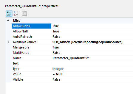 Since your Report SqlDataSource query doesn't return a field representing '[tblProducts].[QuadrantBitMask]', you may set it as a value of an additional Report Parameter. This will let you use it also as an SqlDataSource parameter, for example, in the Where clause of the query. You may use DataSource to specify the AvailableValues for Report Parameters - Report Parameter Properties.