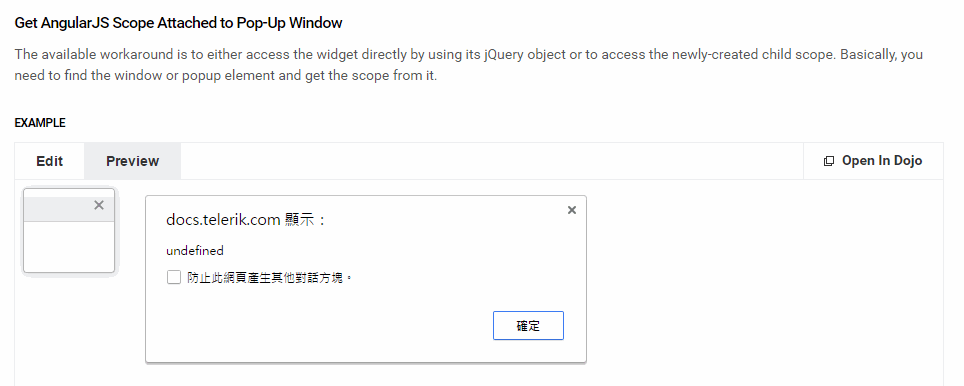 The <span ng-bind="text"> inside KendoWindow is bound to main scope's text property. We can change <input ng-model="text"> and see the text of button changing too. I use these code to get the scopes behind both <span> and <input>, but the scope() result of span inside KendowWindow return undefined.