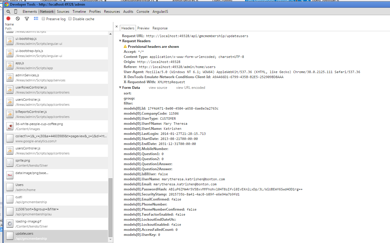I am using the Kendo grid with Angular and Asp.Net MVC WebApi. I have the grid set up with batch editing and have tried to follow the examples, but I am not getting the data to be updated in my method in the WebApi Controller. I see the data on the update request but when I hit the break point in the method, the parameter has a count of 0. I have tried different scenarios, but have had no luck. Any help is very much appreciated. I have attached screen shots of the parameter at break point and the data on the request in the developer tool in Chrome. Here is my Angular code for the the grid: