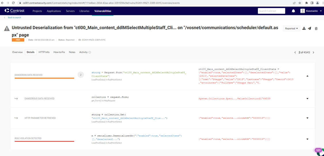the "Contrast Security" tool we use shows us a "Untrusted Deserialization" Vulnerability found on one of the ASPX (webForms) page where we utilize RadMultiSelect control. (Our current version is 2021.1.119.45).