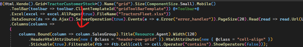 In this example below the column bind the property name "SalesGroup", but the bound method automatically resolves the name "salesGroup" (the name of JsonPropertyName attribute). Since the first letter is lowercase, the column does not display the value