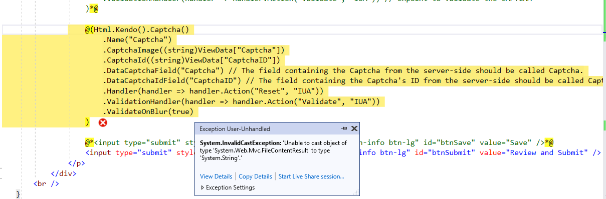 ViewData["Captcha"] = GetCatchaImage(captchaImage.UniqueId);//Url.Action("image", "IUA", new { captchaId = captchaImage.UniqueId });