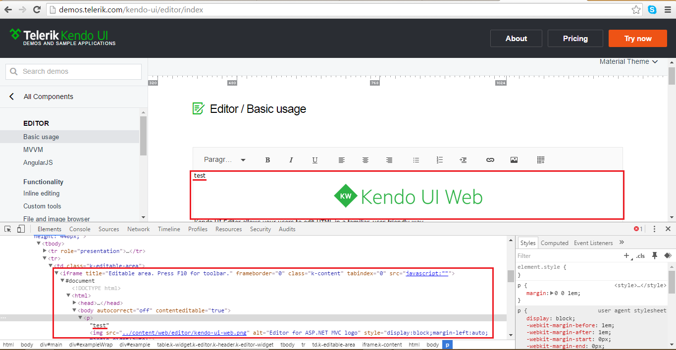 I tried to test the url (http://demos.telerik.com/kendo-ui/editor/index) where you can find the KendoEditor. During recording, In that editor I have typed as "test". When I playback those steps in telerik test studio, it shows error that element is not found. Please find the attachment where you cannot find the HTMLInput element in the KendoEditor. Please guide me how to test on this.