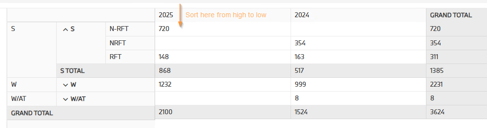 I don't really want to sort by row or column title, but actually have the data sorted by the value (the measure). So to click the column header and have all rows in the order of the row values for the selected column. For multiple row dimensions, the sorting would first have to apply to the highest dimension (S, W, W/AT) and than further down the nested dimensions.