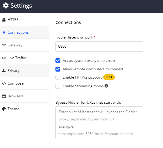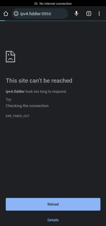I then set up this IP and 8866 port as proxy for my WiFi connection on the Android phone and navigated to ipv4.fiddler:8866 But it constantly responds with ERR_TIMED_OUT and keeps reloading. Also nothing from the mobile device is visible in Fiddler Live Traffic on Windows machine. I wasn't able to find a related topic on the forum. Any help would be greatly appreciated.