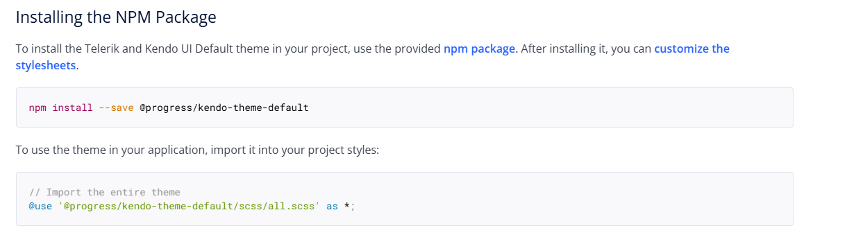 To install npm package I followed the documentation: Telerik and Kendo UI Default Theme Overview | Design System Kit:
