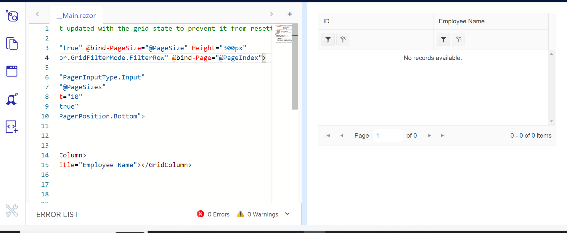 <TelerikGrid Data="@MyData" Pageable="true" @bind-PageSize="@PageSize" Height="300px"