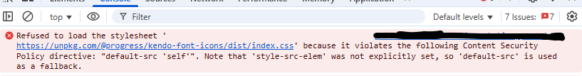 • If you use Kendo Font Icons, ensure that the font files are served from an allowed source. Update your CSP to allow font loading with a rule like: