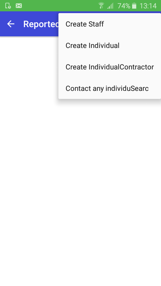 The script Elena sent you works and I have attached an example with your app. Open the attached project and examine the android test, I have create two examples at the end. One is dynamicaly tapping on the "Create staff" option by name, the other uses coordinates.