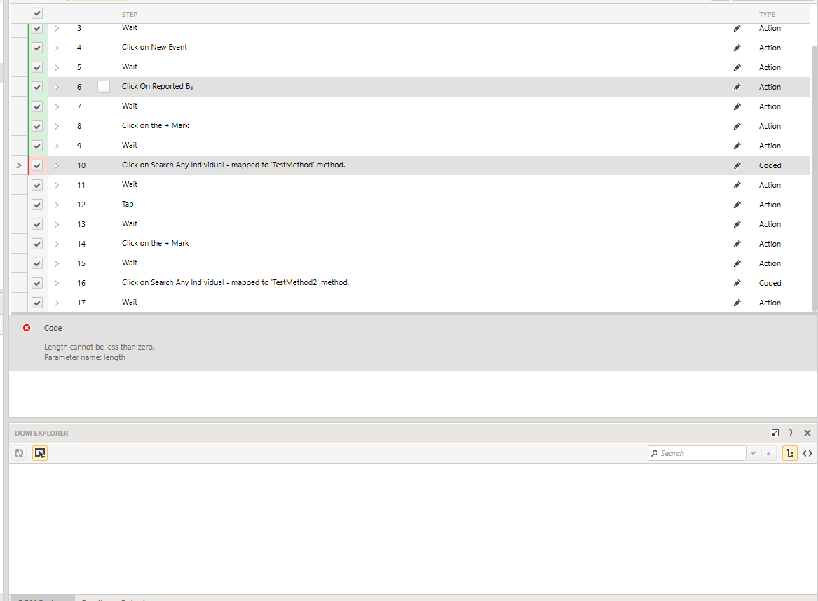Issue 01: the coded step successfully passes if there is only one coded step included in the test case. But if there is more than one coded step in the test cases, Its failing (Its failing in the first coded step). please look in to the attached screenshot examples of a test case that has two coded step. This test cases fails in the step 10 coded step. However If I remove the step 22 coded step and try again, its passing the coded step 10. can you please look in to this and let me know.