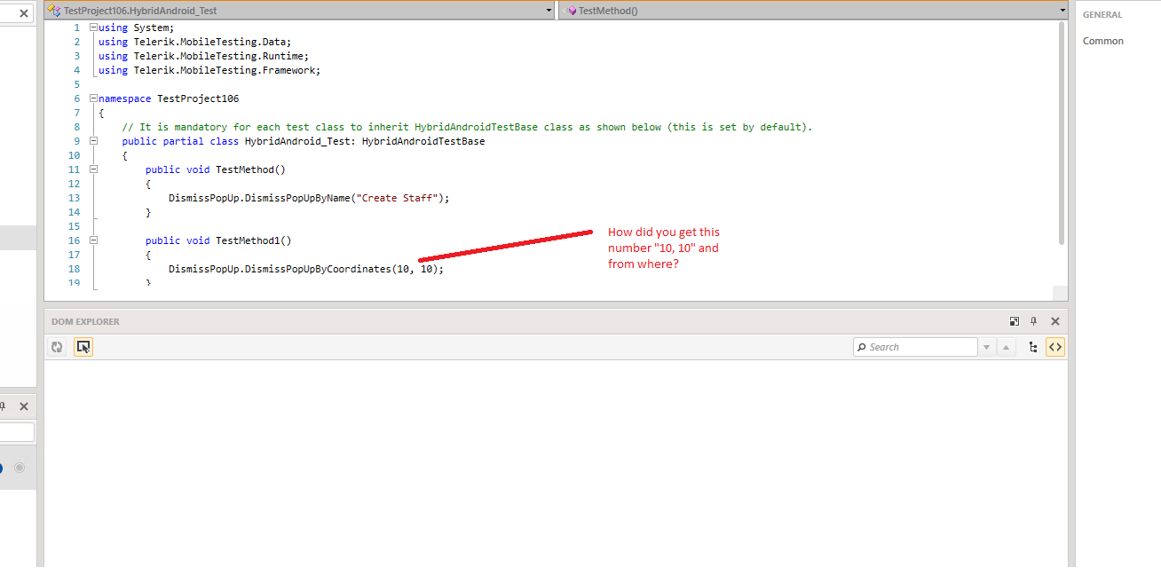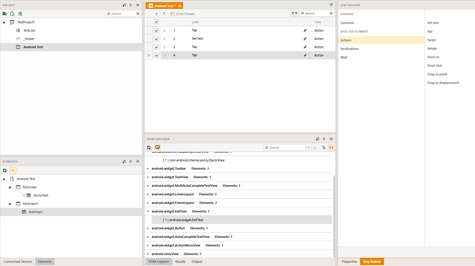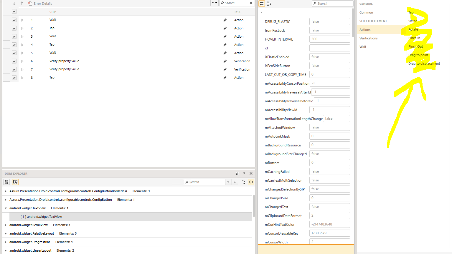 Q3: Sorry for not explaining it properly. I want to set a text in a Text box using code. The reason why I am doing this because sometimes the set text action is not recording when I tap the text box and type something. I am using a real phone to record tests. I have no idea why is this happening. I tried using the DOM tree method and I couldn't find any Set Text option in Action menu (Please look in to the attached image highlighted area in yellow). so that’s why I am planning to use a coded step to set a text in a text box. Can you please let me know how I can use coded step to set a text in a text box?