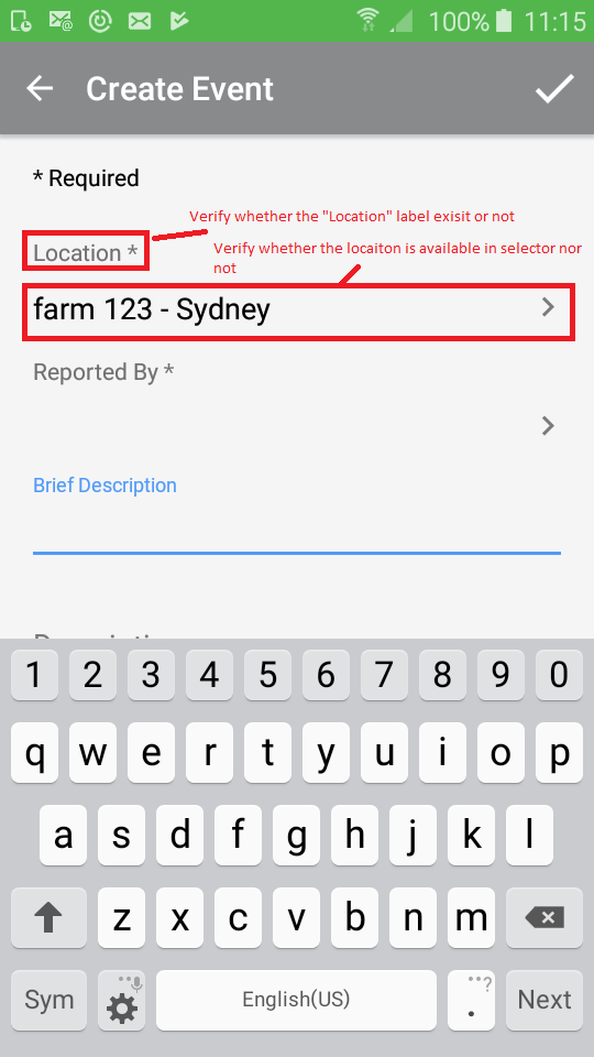 Q5: The create event should be visible in the DOM tree, looks like part of the app so we should be able to directly use the verify visible and verify exist steps. You can also put a screenshot compare if you think it's needed, it may be an overkill though. The items in the dropdown should be visible in the DOM tree, so you just have to find them and verify that an item with desired content (the city in this case) exists. You can even make a search query by textContent where the content is: farm123 - Sydney. If the elements is found that way, we can say 100% that this item exists in the dropdown.