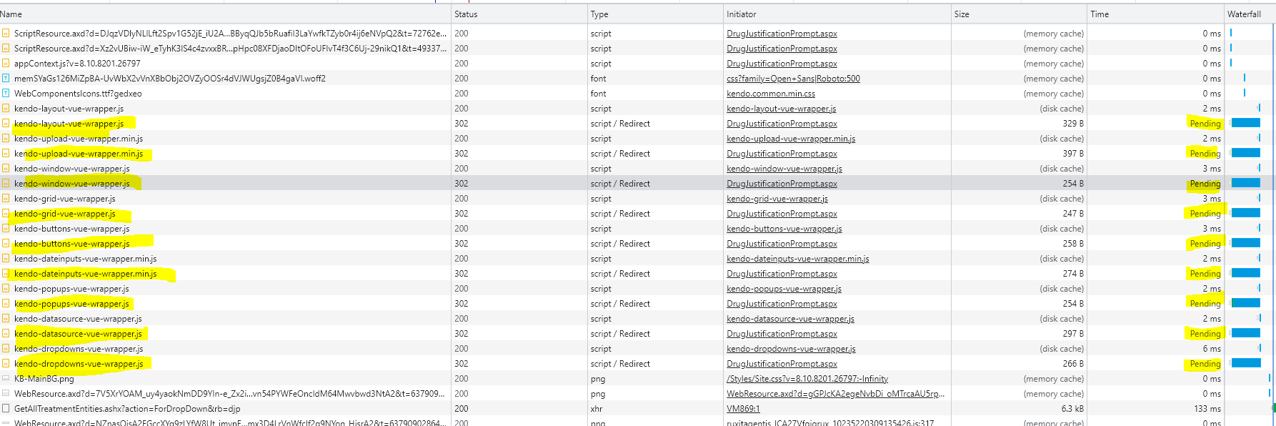 Here is a screen shot of the network traffic. If you scroll to the right you will see they are all in the state of pending.