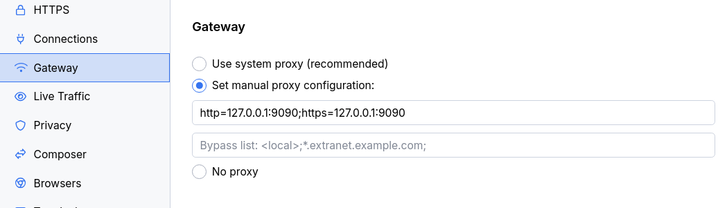 So I connect Fiddler to mitmproxy by setting the gateway proxy to mitmproxy listening at localhost:9090.