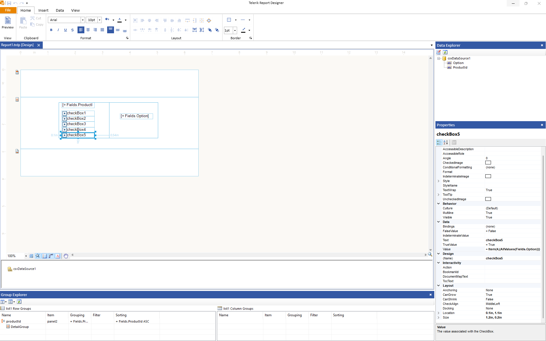 This way, we can check for each checkbox whether it should be checked for the specific Option ID. Note that you may need to sort the data by the OptionID field to ensure that the order of the IDs is correct for the order in which we check them in the CheckBox items. I've made a sample report for you to have a look at and test.