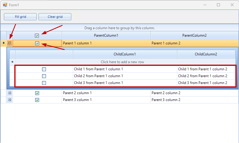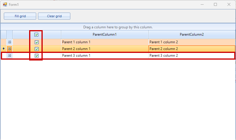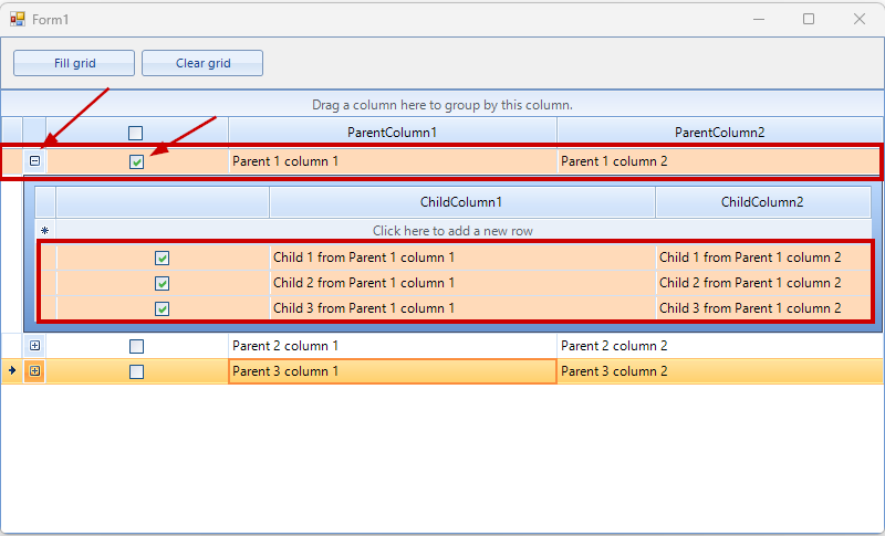 There are also some issues with the header check in the child rows. In this case, I do not have the EnableHeaderCheckBox = true in the GridViewTemplate but the problem is similar. Checking all the child rows of a certain parent row through the header check, updates the value on the "Chk" column but does not update it visually with the color.