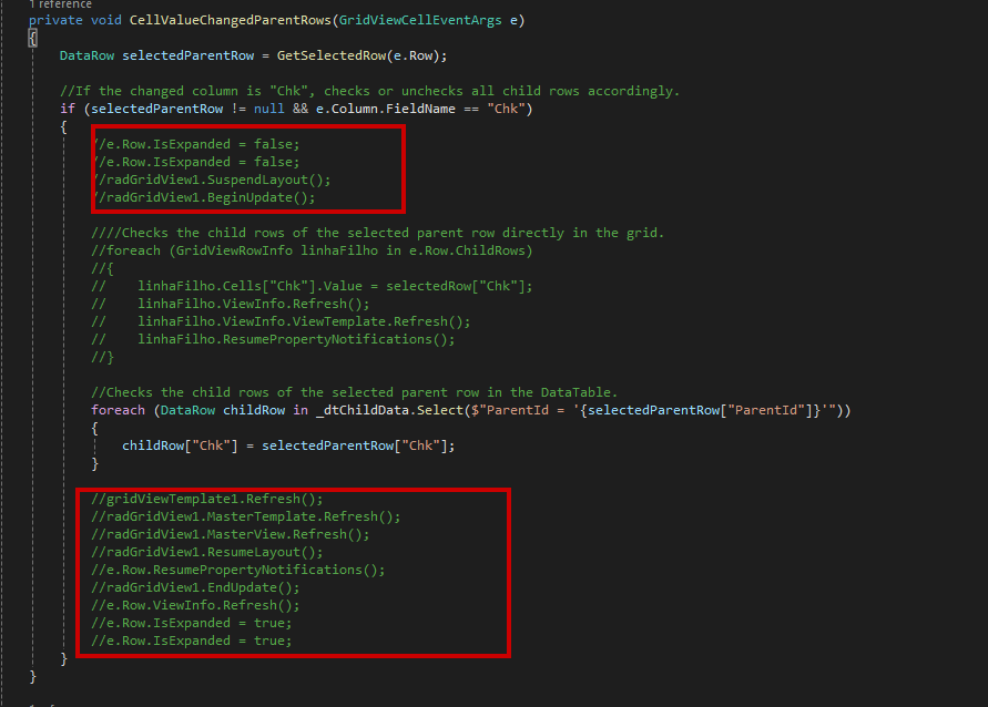 I am developing a form that has a radgrid with hierarchy and in some instances, the parent row makes changes to the child rows and vice versa.
