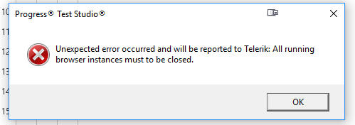 [09/08 09:21:52,Telerik.TestStudio.Desktop.exe(3132:1)] First trace message from process 3132: "C:\Program Files (x86)\Telerik\Test Studio\Bin\Telerik.TestStudio.Desktop.exe" False "C:\Users\dalmaso\git\automacao-ui-clicq" /trial[09/08 09:21:52,Telerik.TestStudio.Desktop.exe(3132:1)] First trace message from foreground thread "Application start thread" (managed ID = 1, native ID = 21140).[09/08 09:21:52,Telerik.TestStudio.Desktop.exe(3132:1),TestStudio] TestExplorerController.ExecuteCommand() : EXCEPTION! (see below) Outer Exception Type: ArtOfTest.WebAii.Core.BrowserConfigurationException Message: All running browser instances must to be closed. HRESULT: 0x80131500 (Official ID (if app.) = COR_E_EXCEPTION, Error Bit = FAILED, Facility = FACILITY_URT, Code = 5376) Call Stack: em ArtOfTest.WebAii.Core.BrowserConfiguration.VerifyAllProcessesAreClosed(String processName) em ArtOfTest.WebAii.Core.BrowserConfiguration.EndRunningProcesses(String processName) em ArtOfTest.WebAii.Design.UI.RecordersController.PromptToCloseRunningBrowserInstances(String processName) em ArtOfTest.WebAii.Design.UI.TestExplorerController.ExecuteScenario(ExecutionType exeType, Boolean debuggerEnabled, IntPtr existingBrowserHandle, IList`1 selectedExecutionSteps, Boolean showBrowserSelection) em ArtOfTest.WebAii.Design.UI.TestExplorerController.ExecuteCommand(ICommand command, Object parameters)[09/08 09:23:33,Telerik.TestStudio.Desktop.exe(3132:1),Framework] FireFoxInstallation.EnumFireFoxInstallations() : Valid Firefox 55.0.0.3 (x86) installation found at "C:\Users\dalmaso\programas\firefox36\firefox.exe".[09/08 09:23:33,Telerik.TestStudio.Desktop.exe(3132:1),Framework] FireFoxInstallation.EnumFireFoxInstallations() : Valid Firefox 55.0.0.3 (x86) installation found at "C:\Users\dalmaso\programas\firefox36\firefox.exe".[09/08 09:23:33,Telerik.TestStudio.Desktop.exe(3132:1),Framework] FireFoxInstallation.EnumFireFoxInstallations() : Valid Firefox 55.0.0.3 (x86) installation found at "C:\Users\dalmaso\programas\firefox36\firefox.exe".[09/08 09:23:33,Telerik.TestStudio.Desktop.exe(3132:1),Framework] FireFoxInstallation.EnumFireFoxInstallations() : Valid Firefox 55.0.0.3 (x86) installation found at "C:\Users\dalmaso\programas\firefox36\firefox.exe".[09/08 09:23:33,Telerik.TestStudio.Desktop.exe(3132:1),Framework] FireFoxInstallation.EnumFireFoxInstallations() : Valid Firefox 55.0.0.3 (x86) installation found at "C:\Users\dalmaso\programas\firefox36\firefox.exe".[09/08 09:23:33,Telerik.TestStudio.Desktop.exe(3132:1),Framework] FireFoxInstallation.EnumFireFoxInstallations() : Valid Firefox 55.0.0.3 (x86) installation found at "C:\Users\dalmaso\programas\firefox36\firefox.exe".[09/08 09:23:33,Telerik.TestStudio.Desktop.exe(3132:1),Framework] FireFoxInstallation.EnumFireFoxInstallations() : Valid Firefox 55.0.0.3 (x86) installation found at "C:\Users\dalmaso\programas\firefox36\firefox.exe".[09/08 09:23:33,Telerik.TestStudio.Desktop.exe(3132:1),Framework] FireFoxInstallation.EnumFireFoxInstallations() : Valid Firefox 55.0.0.3 (x86) installation found at "C:\Users\dalmaso\programas\firefox36\firefox.exe".[09/08 09:23:33,Telerik.TestStudio.Desktop.exe(3132:1),Framework] FireFoxInstallation.EnumFireFoxInstallations() : Valid Firefox 55.0.0.3 (x86) installation found at "C:\Users\dalmaso\programas\firefox36\firefox.exe".[09/08 09:23:33,Telerik.TestStudio.Desktop.exe(3132:1),Framework] FireFoxInstallation.EnumFireFoxInstallations() : Valid Firefox 55.0.0.3 (x86) installation found at "C:\Users\dalmaso\programas\firefox36\firefox.exe".[09/08 09:23:33,Telerik.TestStudio.Desktop.exe(3132:1),Framework] FireFoxInstallation.EnumFireFoxInstallations() : Valid Firefox 55.0.0.3 (x86) installation found at "C:\Users\dalmaso\programas\firefox36\firefox.exe".[09/08 09:23:41,Telerik.TestStudio.Desktop.exe(3132:1),TestStudio] BrowsersViewModel.CalibrateBrowser() : EXCEPTION! (see below) Outer Exception Type: ArtOfTest.WebAii.Core.BrowserConfigurationException Message: All running browser instances must to be closed. HRESULT: 0x80131500 (Official ID (if app.) = COR_E_EXCEPTION, Error Bit = FAILED, Facility = FACILITY_URT, Code = 5376) Call Stack: em ArtOfTest.WebAii.Core.BrowserConfiguration.VerifyAllProcessesAreClosed(String processName) em ArtOfTest.WebAii.BrowserSpecialized.Chrome.ChromeConfiguration.ConfigureBrowser(String& error) em ArtOfTest.WebAii.Core.BrowserConfigurationUtils.ConfigureBrowser(BrowserType browser, String& error) em ArtOfTest.WebAii.Design.UI.BrowsersViewModel.CalibrateBrowser(BrowserType browser)