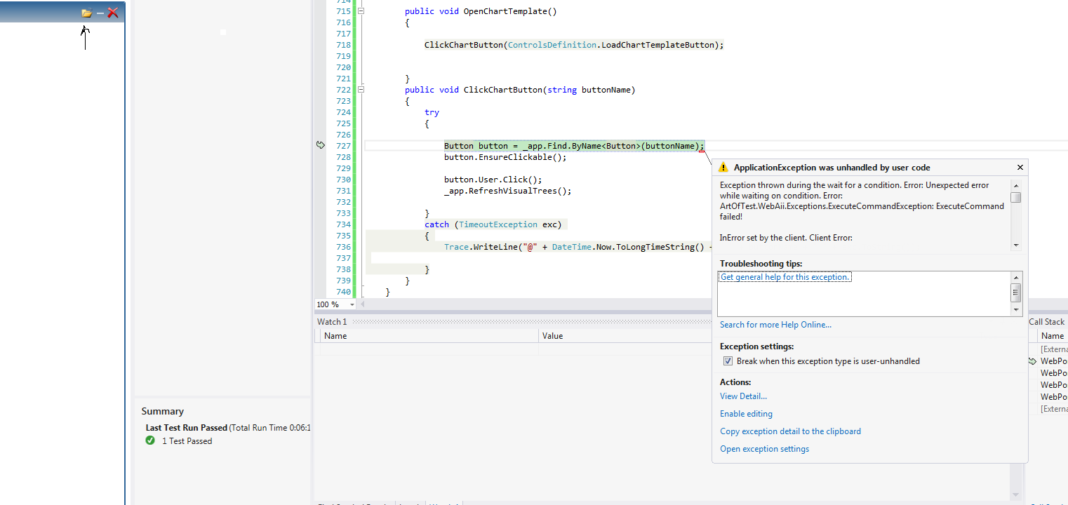 public void OpenChartTemplate() { ClickChartButton(ControlsDefinition.LoadChartTemplateButton); } public void ClickChartButton(string buttonName) { try { Button button = _app.Find.ByName<Button>(buttonName); button.EnsureClickable(); button.User.Click(); _app.RefreshVisualTrees(); } catch (TimeoutException exc) { Trace.WriteLine("@" + DateTime.Now.ToLongTimeString() + " " + buttonName + " " + exc.ToString()); } }