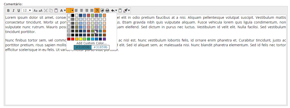 This is my RadEditor with the options I need enabled. Right now, my browser has its zoom at 100%. When I click to change the color of the text or my back color, it shows up just fine under the icon. Plus, choosing the colors changes the text as it should.