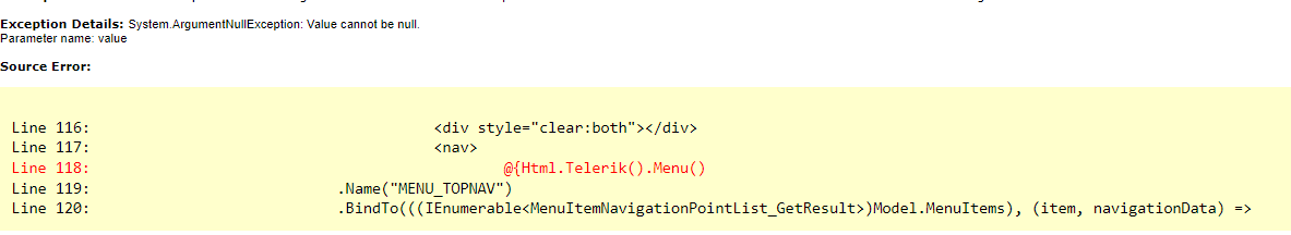 [ArgumentNullException: Value cannot be null. Parameter name: value] System.Web.Caching.CacheEntry..ctor(String key, Object value, CacheDependency dependency, CacheItemRemovedCallback onRemovedHandler, DateTime utcAbsoluteExpiration, TimeSpan slidingExpiration, CacheItemPriority priority, Boolean isPublic, CacheInternal cache) +11948326 System.Web.Caching.CacheInternal.DoInsert(Boolean isPublic, String key, Object value, CacheDependency dependencies, DateTime utcAbsoluteExpiration, TimeSpan slidingExpiration, CacheItemPriority priority, CacheItemRemovedCallback onRemoveCallback, Boolean replace) +141 System.Web.Caching.AspNetCache.Insert(String key, Object item, CacheInsertOptions options) +107 Telerik.Web.Mvc.Infrastructure.Implementation.CacheProvider.Insert(String key, Object value) +54 Telerik.Web.Mvc.Infrastructure.Implementation.Cache.Get(String key, Func`1 defaultValueFactory) +146 Telerik.Web.Mvc.Infrastructure.Implementation.ControllerContextCache.GetControllerContext(RequestContext requestContext, String controllerName, String areaName) +204 Telerik.Web.Mvc.Infrastructure.Implementation.AuthorizationContextCache.AuthorizationContextFactory(RequestContext requestContext, String controllerName, String actionName, String areaName) +52 Telerik.Web.Mvc.Infrastructure.Implementation.<>c__DisplayClass1.<GetAuthorizationContext>b__0() +44 Telerik.Web.Mvc.Infrastructure.Implementation.Cache.Get(String key, Func`1 defaultValueFactory) +95 Telerik.Web.Mvc.Infrastructure.Implementation.AuthorizationContextCache.GetAuthorizationContext(RequestContext requestContext, String controllerName, String actionName, RouteValueDictionary routeValues) +346 Telerik.Web.Mvc.Infrastructure.Implementation.ControllerAuthorization.IsAccessibleToUser(RequestContext requestContext, String controllerName, String actionName, RouteValueDictionary routeValues) +151 Telerik.Web.Mvc.Infrastructure.Implementation.NavigationItemAuthorization.IsAccessibleToUser(RequestContext requestContext, INavigatable navigationItem) +367 Telerik.Web.Mvc.UI.NavigationItemContainerExtensions.WriteItem(TItem item, TComponent component, IHtmlNode parentTag, INavigationComponentHtmlBuilder`1 builder) +315 Telerik.Web.Mvc.UI.<>c__DisplayClass4.<WriteHtml>b__3(MenuItem item) +36 Telerik.Web.Mvc.Extensions.EnumerableExtensions.Each(IEnumerable`1 instance, Action`1 action) +159 Telerik.Web.Mvc.UI.Menu.WriteHtml(HtmlTextWriter writer) +352 Telerik.Web.Mvc.UI.ViewComponentBase.Render() +87 Telerik.Web.Mvc.UI.ViewComponentBuilderBase`2.Render() +15