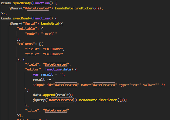 </columns>Then in the kendo-deferred-script javascript file I can see the dateCreated element is inialized at the beginning of the file and in the template function:
