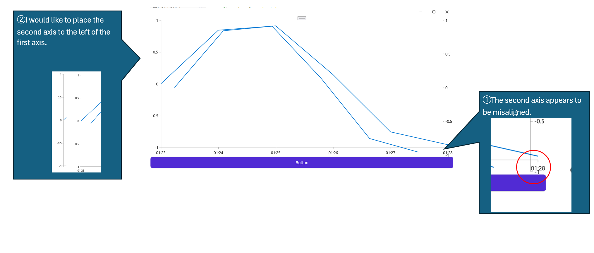You can define the chart axis next to each other by using the native chart control. This customization required subscribing to the handler changed and add additional logic to access the native chart and series. So in this case you have one chart definition and two series: