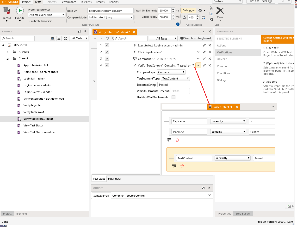 To check for the "Status" in the next cell, you need to bind it from the Properties pane -> Bindings for step 4 and keep the CompareType as Contains. Test Studio will again check the above mentioned string for the text content.