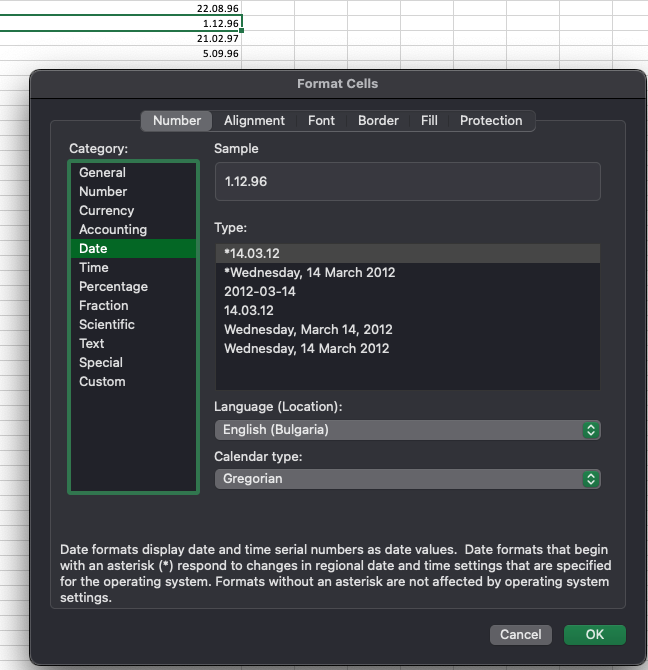 Catogory is displayed as "General", instead of date and any of the possible types-formats