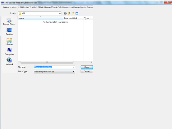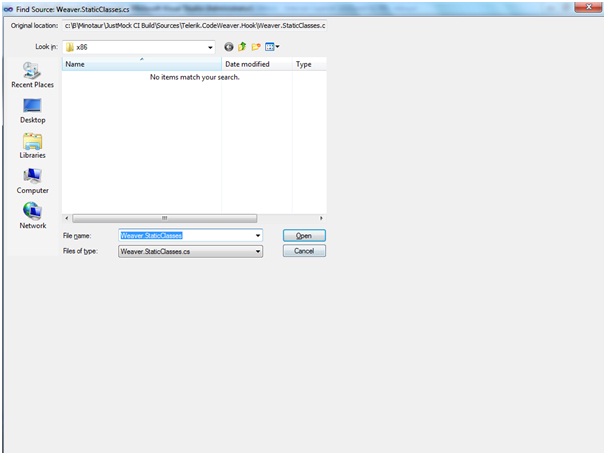 The debugger could not locate the source file 'c:\B\Minotaur\JustMock CI Build\Sources\Telerik.CodeWeaver.Hook\Weaver.StaticClasses.cs'.