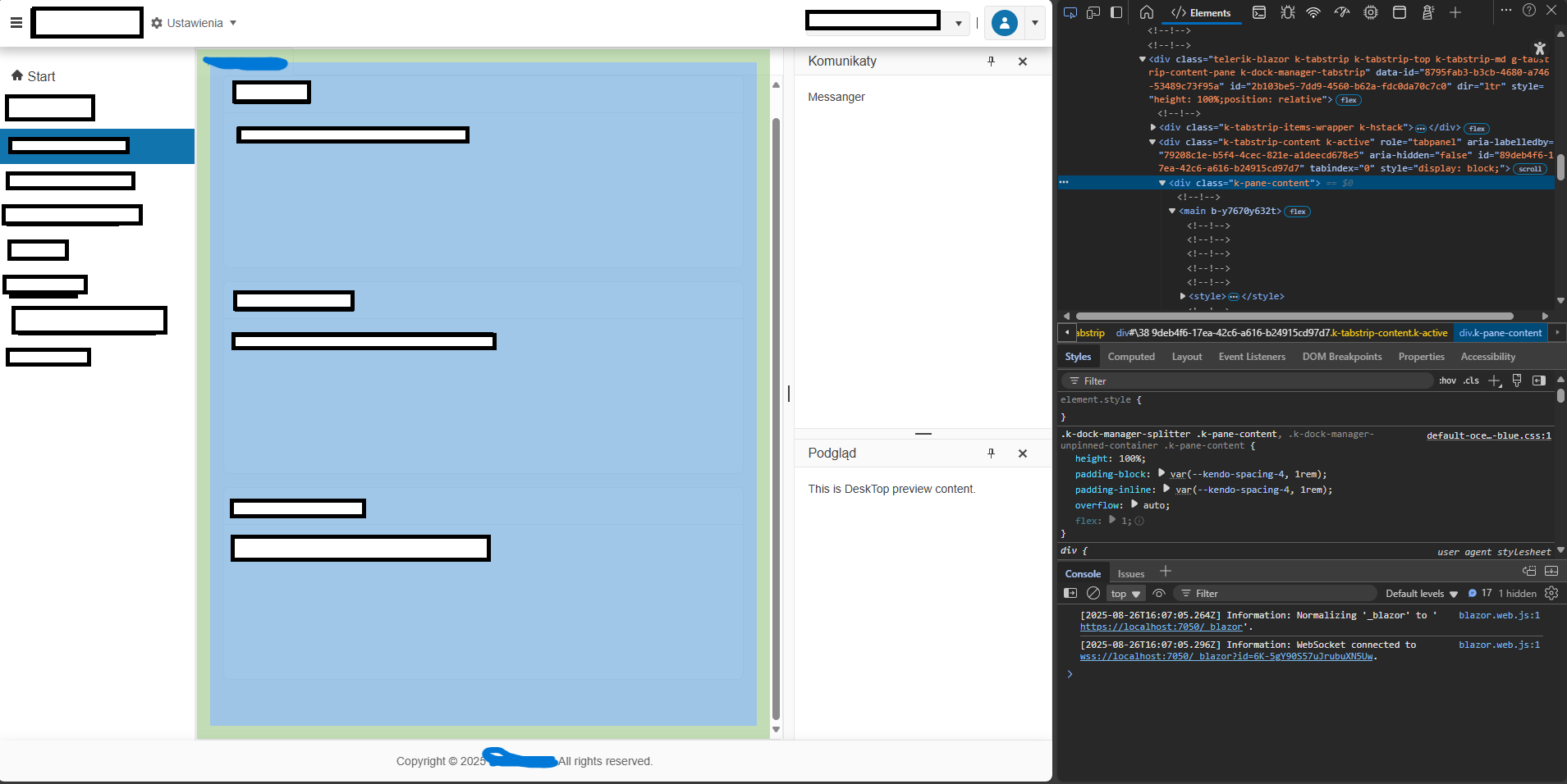 Dockable="false">- The content area receives both k-pane-content AND k-tabstrip-content classes.