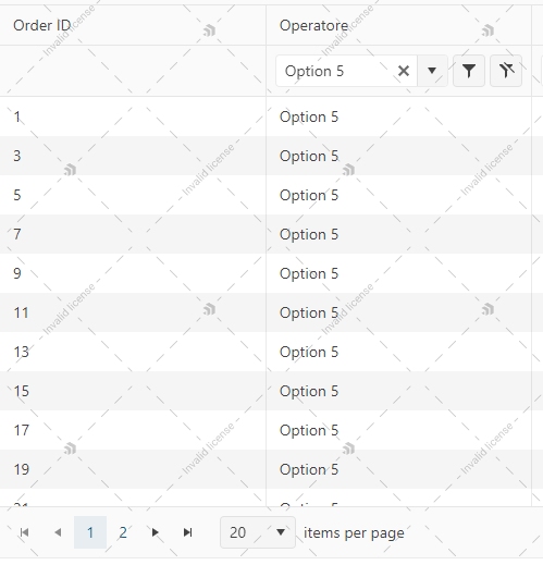 • For the "Operator" column, I would like to display a dropdown with values taken from a list item with value and text. I can see the dropdown and the filter works, but I don't see the corresponding text value in the grid; the cell simply remains empty (even though the filter works correctly).