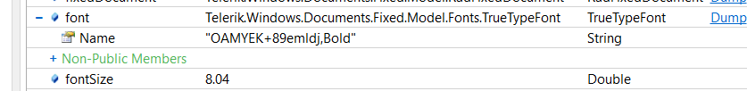 The font name suggests that this is a stripped sunset that contains only characters used with the specific text. With such fonts, you might see only a part of the text or no text. Unfortunately, our API does not provide a way to get the actual font name. I have logged this on our feedback portal so we can improve it and pass the actual name if possible. You can track its progress, subscribe to status changes, and add your comment to it here. I have updated your Telerik points as well.
